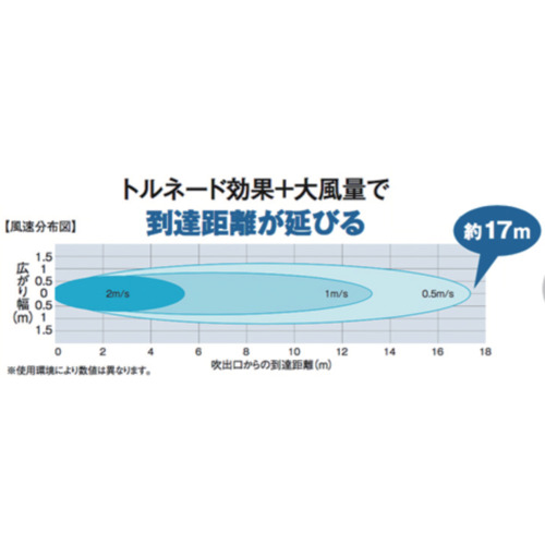 送風口にトルネードガードを採用し、約17m先まで冷風を送りだす
