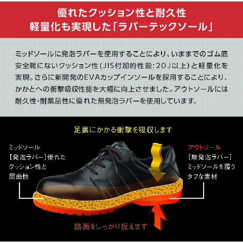・発泡ラバーと無発泡ラバーの2層構造のソールでクッション性、軽量化、耐久性を実現しました。