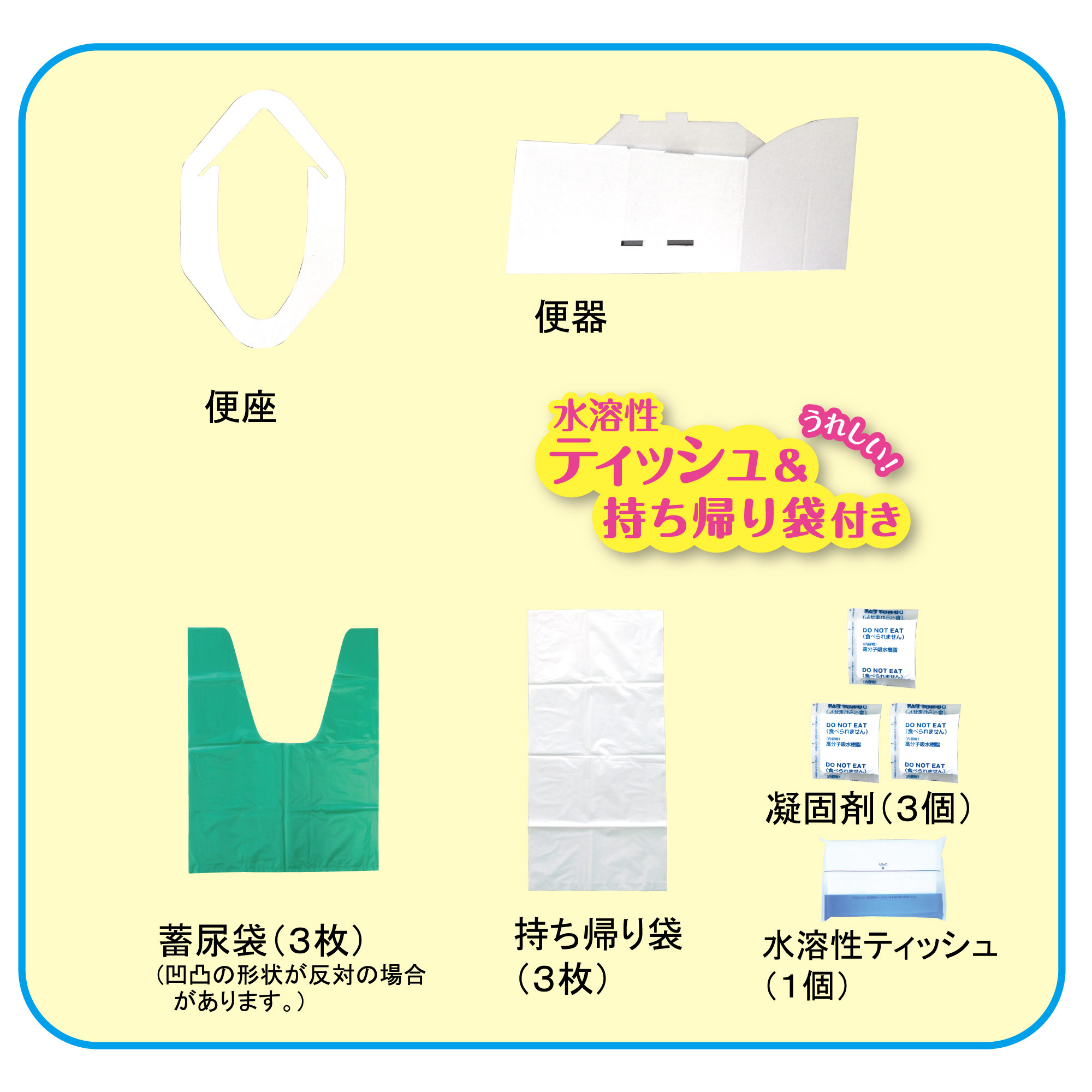 ・セット内容:便器・便座×各1、蓄尿袋・便凝固剤・持ち帰り袋×各3、水溶性ティッシュ×1