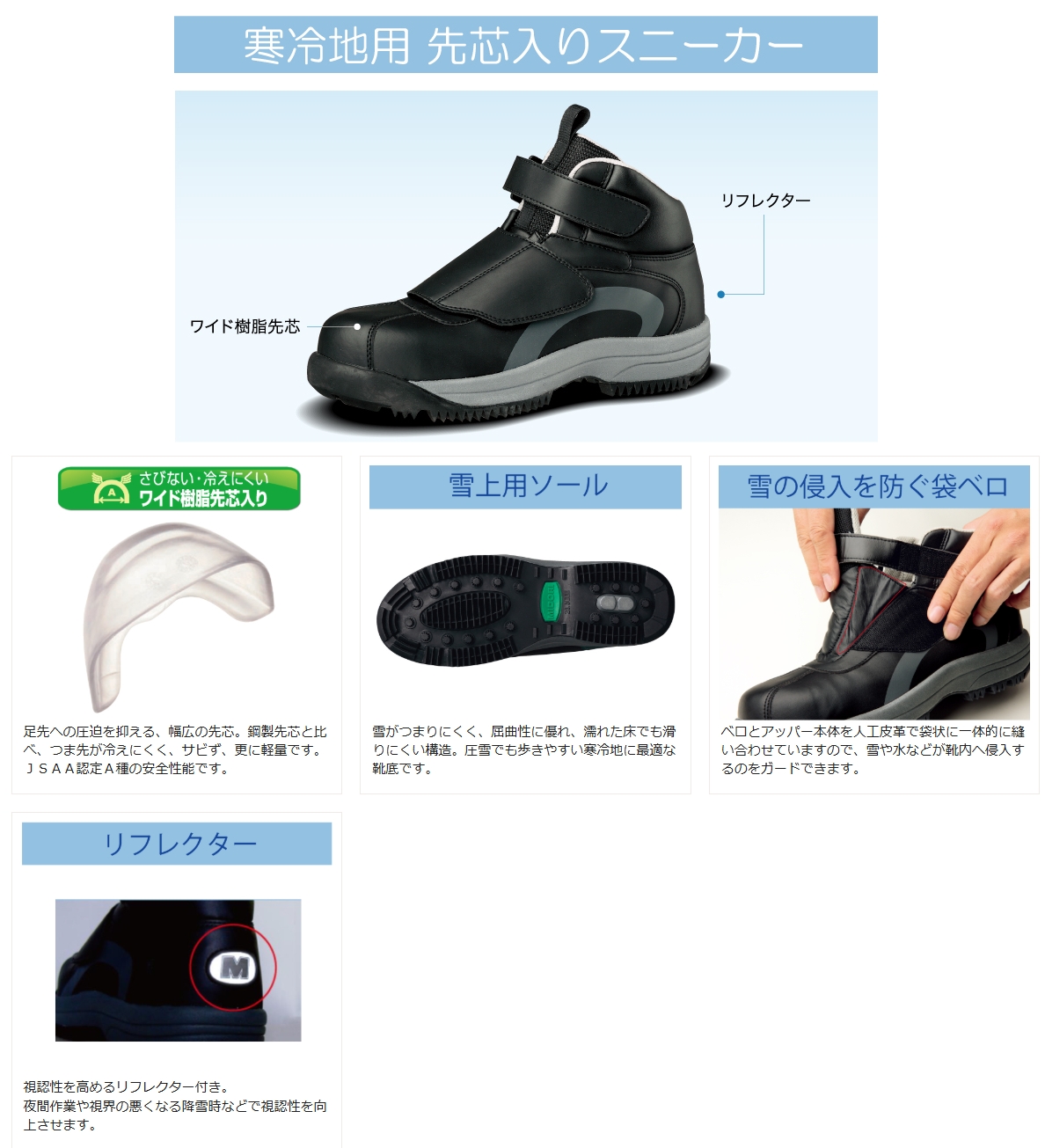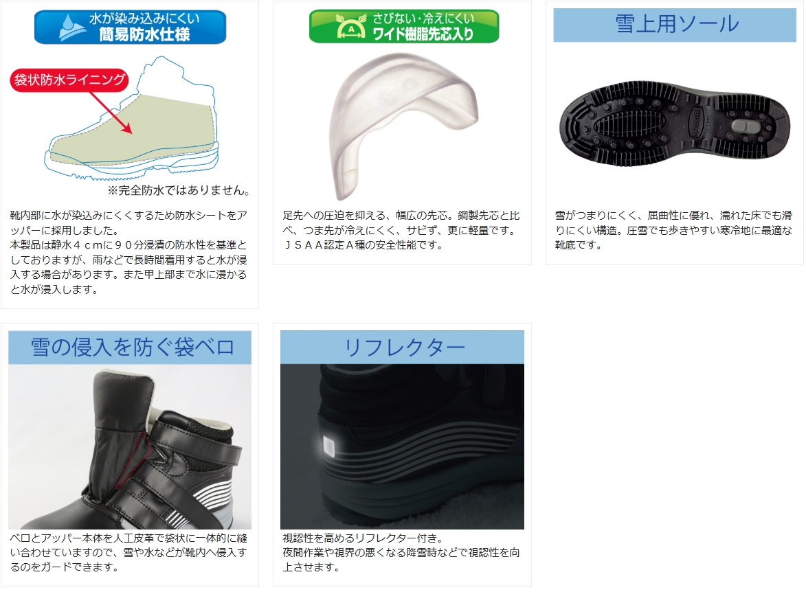 ・靴底は雪がつまりにくく、屈曲性に優れ、濡れた床でも滑りにくい寒冷地に最適な構造です。