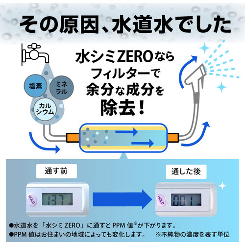 ・本製品は水中の不純物を低減しますが、完全に除去できるものではありません。そのため、地域の水質や使用条件によっては、水シミや跡が残る場合があります。