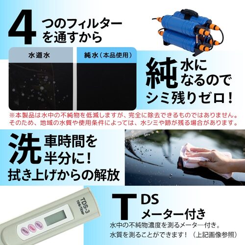 4つのフィルターで水道水の不純物を取り除き、純水で愛車をピカピカに!