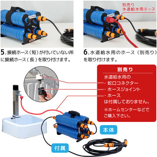 ・セット内容:本体(フィルター×4、フィルター固定用プレート×2、蝶ナット×1、ボルト×1)、水道用ニップル凹×6(予備2個含む)、水道用ニップル凸×6(予備2個含む)、ニップル用キャップ×8、接続ホース(短)×3、接続ホース(長)×1、ノズル×1、グリップベルト×1、TDSメーター×1、シリコンリング×4、テスト用ボタン電池×2、日本語取扱説明書