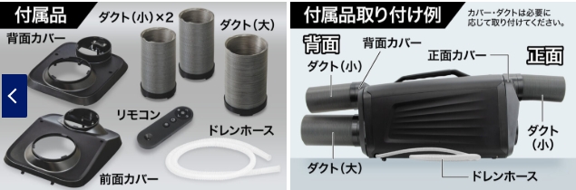 付属品:リモコン、正面カバー、背面カバー、ダクト(大)×1本、ダクト(小)×2本、ドレンホース、リチウムボタン電池(リモコン内蔵)