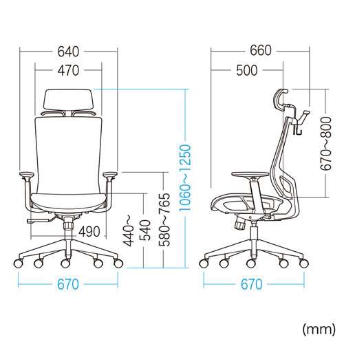 ・サイズ:本体/約W670×D670×H1060~1250mm、背もたれ/約W470×H670~800mm、座面(座面調節)/約W490×D500mm(H440~540mm)、肘高/約580~765mm、脚幅/約670mm