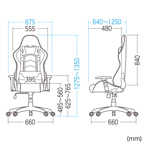 ・サイズ:W675×D660~1250×H1275~1350mm、背もたれ/W555×H840mm、座面(座面調節)/W395×D480mm(H485~560mm)、肘高/約625~765mm
