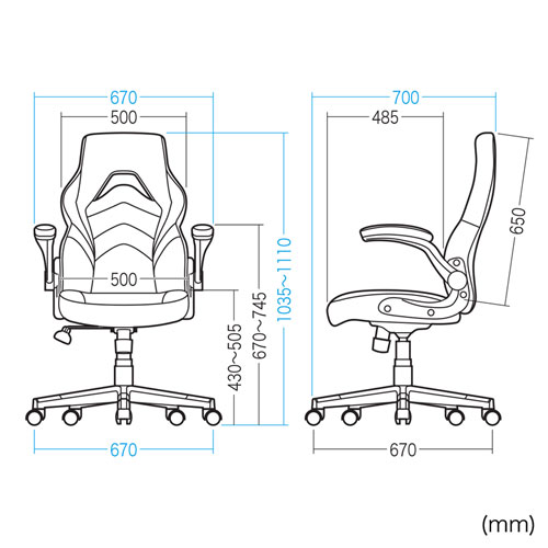 ・サイズ:W670×D700×H1035~1110mm、背もたれ/W500×H650mm、座面(座面調節)/W500×D485mm(H430~505mm)