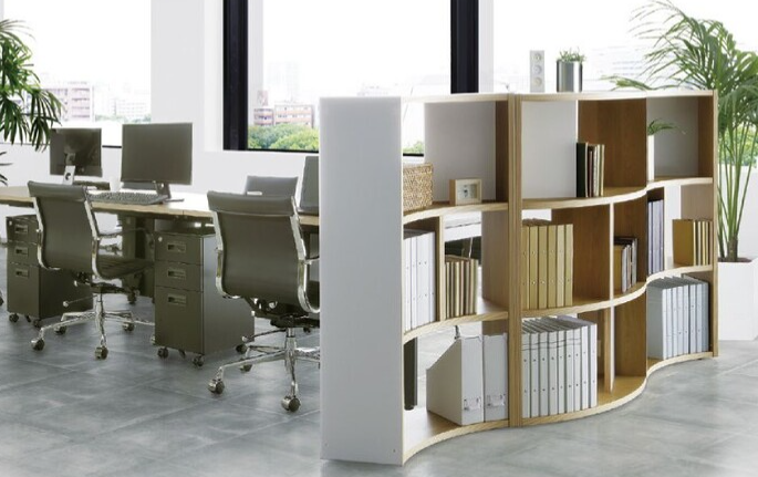 ・ゆったりとした空間を演出するパーティションシェルフ。アール形状が特徴のラウンドシェルフです。