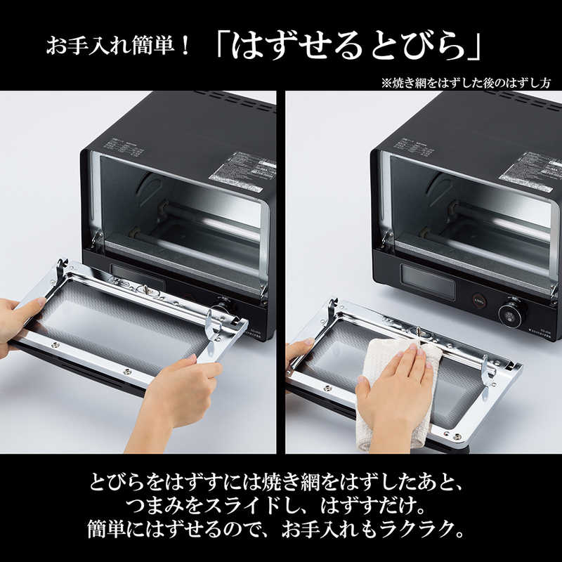 ・丸洗いできる「はずせるもち焼きネット(焼き網)」と「スライド式くず受皿」
