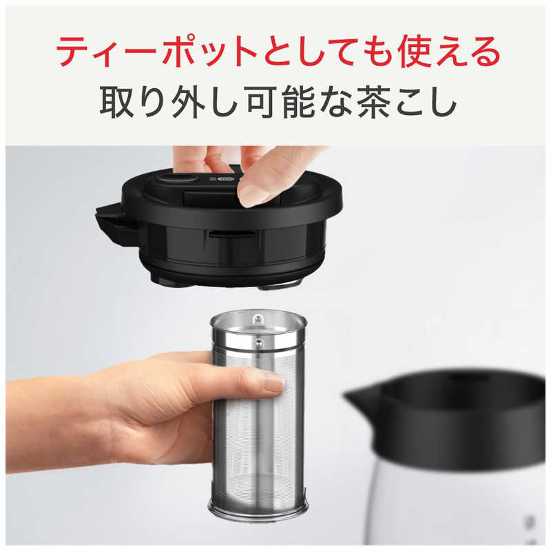 取り外しができる茶こしが付いているので、お湯を沸かした後、ティーポットのように緑茶や紅茶をそのまま淹れることができます。さらに、1~20 分まで 1 分単位での煮出し時間を設定できる“煮出しボタン”を使って、麦茶や豆茶などを手軽に作ることができます。