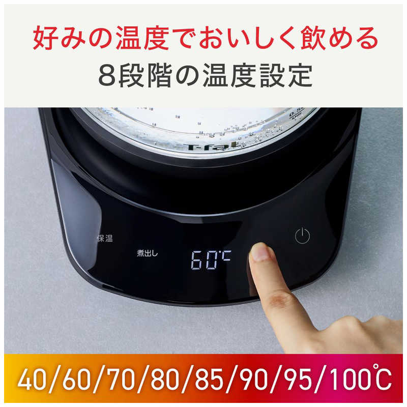 40、60、70、80、85、90、95、100℃まで、8 段階の温度設定が可能です。お湯の温度を変えることで、飲み物の味わいは変化します。お好みに合わせて、好きな温度でお湯を沸かすことができます。また、設定した温度で60分間の保温が可能なので、2杯目を淹れる時や、繰り返しお湯が必要な時などにとても便利。