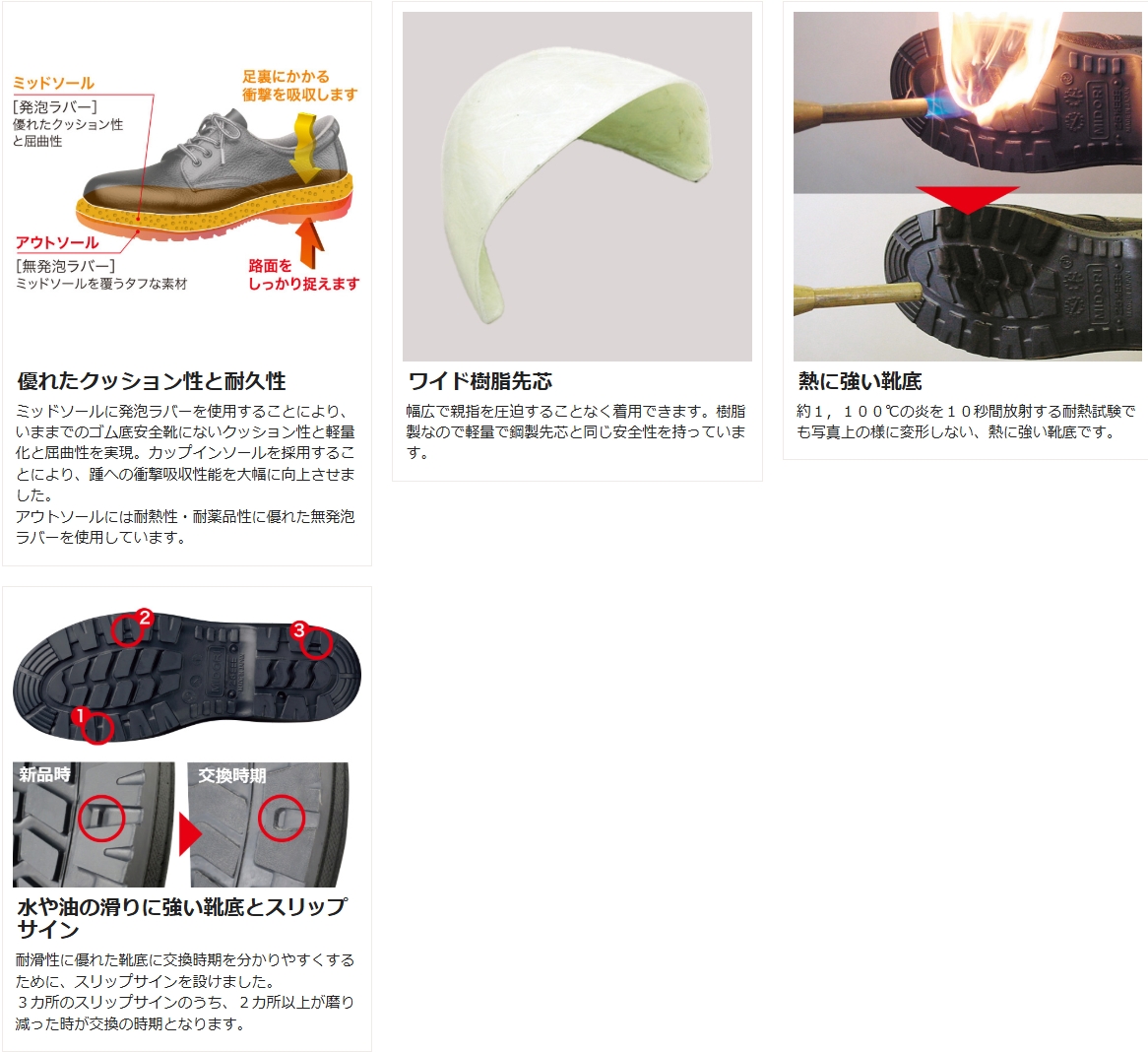 ・ミッドソールに発泡ラバーを使用することにより、いままでのゴム底安全靴にないクッション性と軽量化と屈曲性を実現。カップインソールを採用することにより、踵への衝撃吸収性能を大幅に向上させました。
