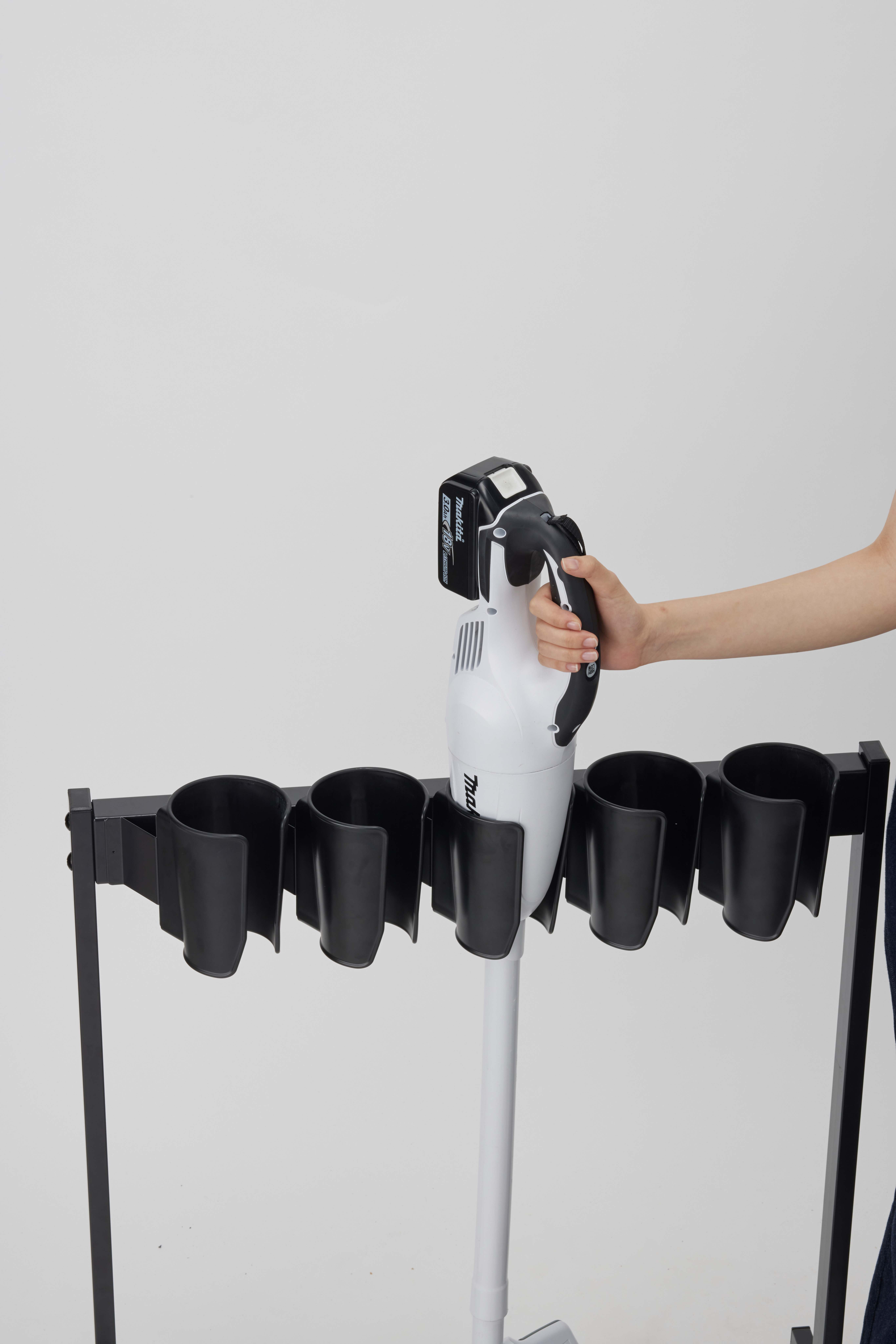 ハンディクリーナー用ハンガー。ヘッド部分の干渉を避けられ、省スペースで収納が可能。