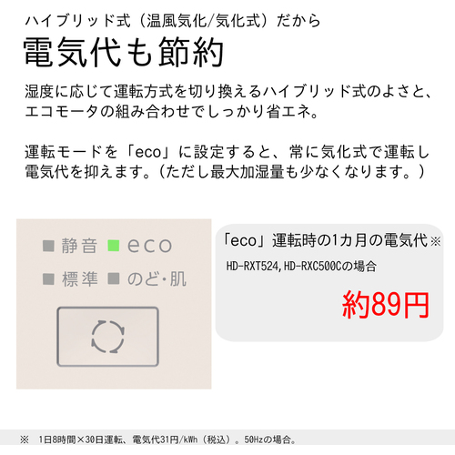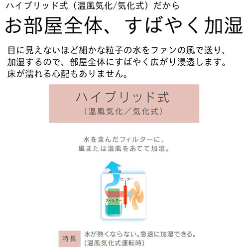 ・気化式と温風気化式のハイブリッド式なので、乾燥している時は素早く加湿し、湿度が安定すると運転を抑え経済的な運転を行います。