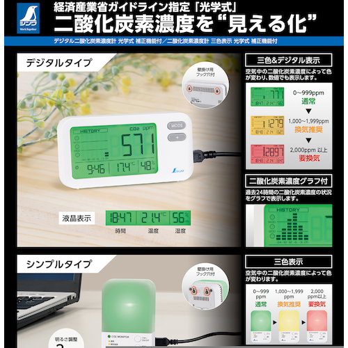 ・経済産業省ガイドライン指定の光学式二酸化炭素濃度計で、二酸化炭素濃度を「見える化」します。
