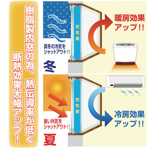 ・窓断熱性能2.44倍(基準化熱貫流抵抗より)JIS断熱等級H-4等級 光ポリカ中空ボード4mm厚を使用した数値。(ポリカ中空ボードは別売となります。)