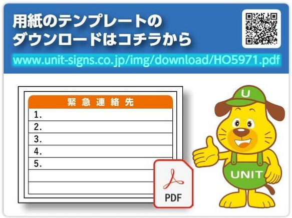 ・事業所における緊急連絡網、緊急搬送先の連絡先及び所在地等を出力し、用紙をポケットに差し込みます。※用紙は付属しません。用紙のテンプレートをダウンロードしてご使用ください。