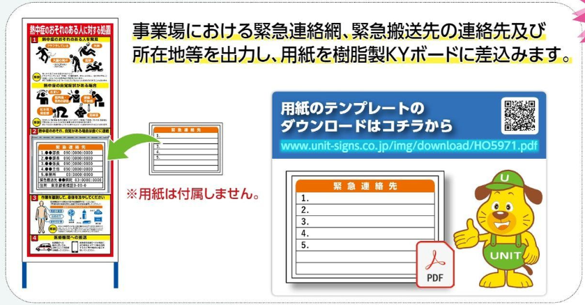 WBGT値と熱中症のおそれを把握。迅速な対処フローを掲示する差込式看板